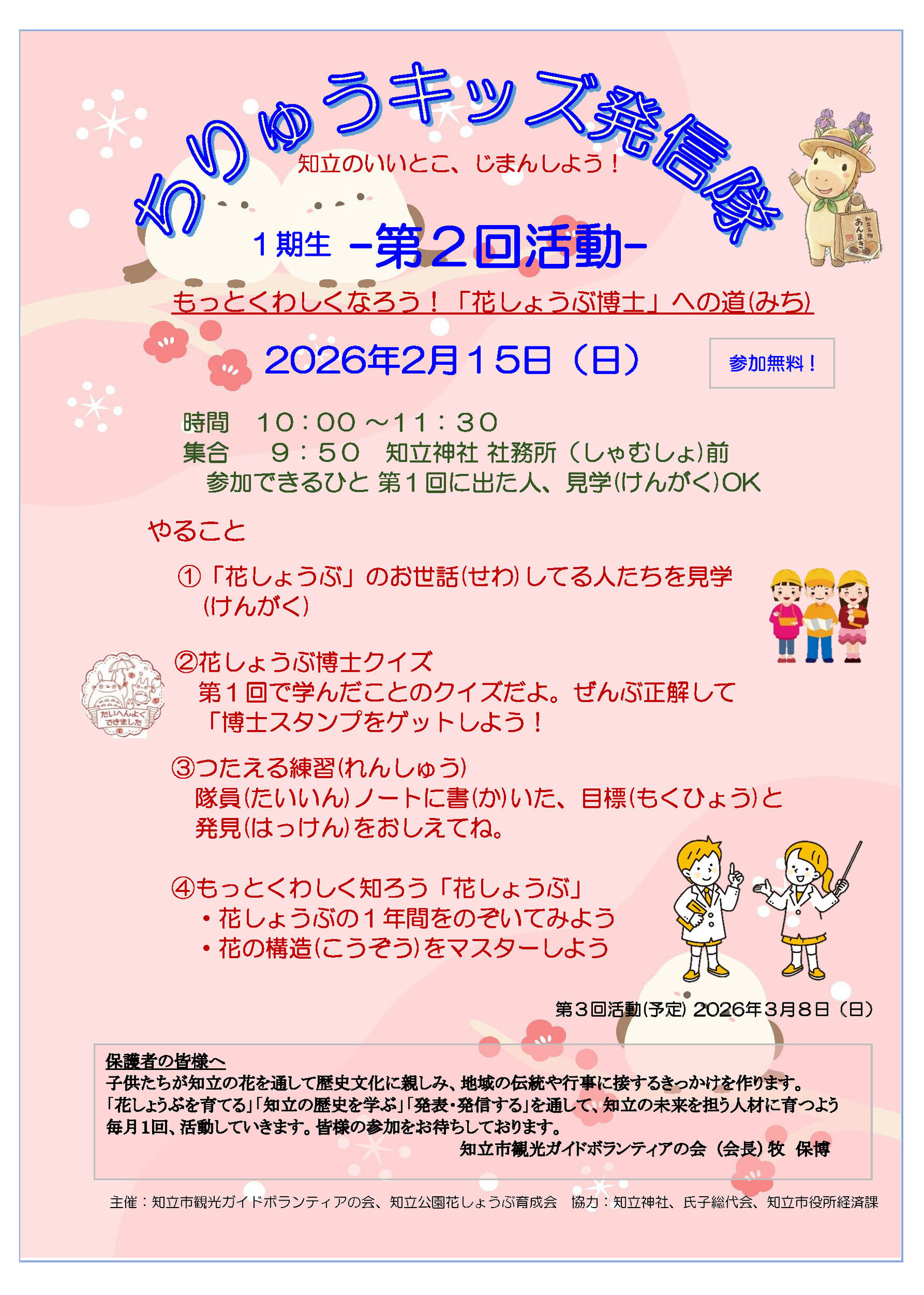 2026年2月15日(日) 時間 10:00~11:30 集合 9:50 知立神社 社務所(しゃむしょ)前 見学(けんがく)もできるので、気になる方は「第2回ちりゅうキッズ発信隊募集」のQRまで